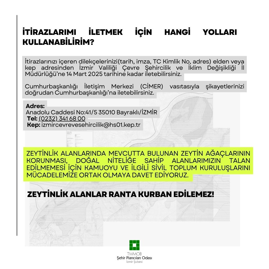 5403 sayılı Toprak Koruma ve Arazi Kullanım Kanunu, 3573 sayılı Zeytinliklerin Islahı ve Yabanilerin Aşılattırılması Kanunu, 3194 sayılı İmar Kanunu ve ilgili tüm mevzuata açıkça aykırı olan bu değişikliklerin geri dönülmesi mümkün olmayan zararlara neden olmaması için itirazlarınızı 14.03.2025 tarihine kadar İzmir Valiliği Çevre, Şehircilik ve İklim Değişikliği İl Müdürlüğü`ne iletebilirsiniz.