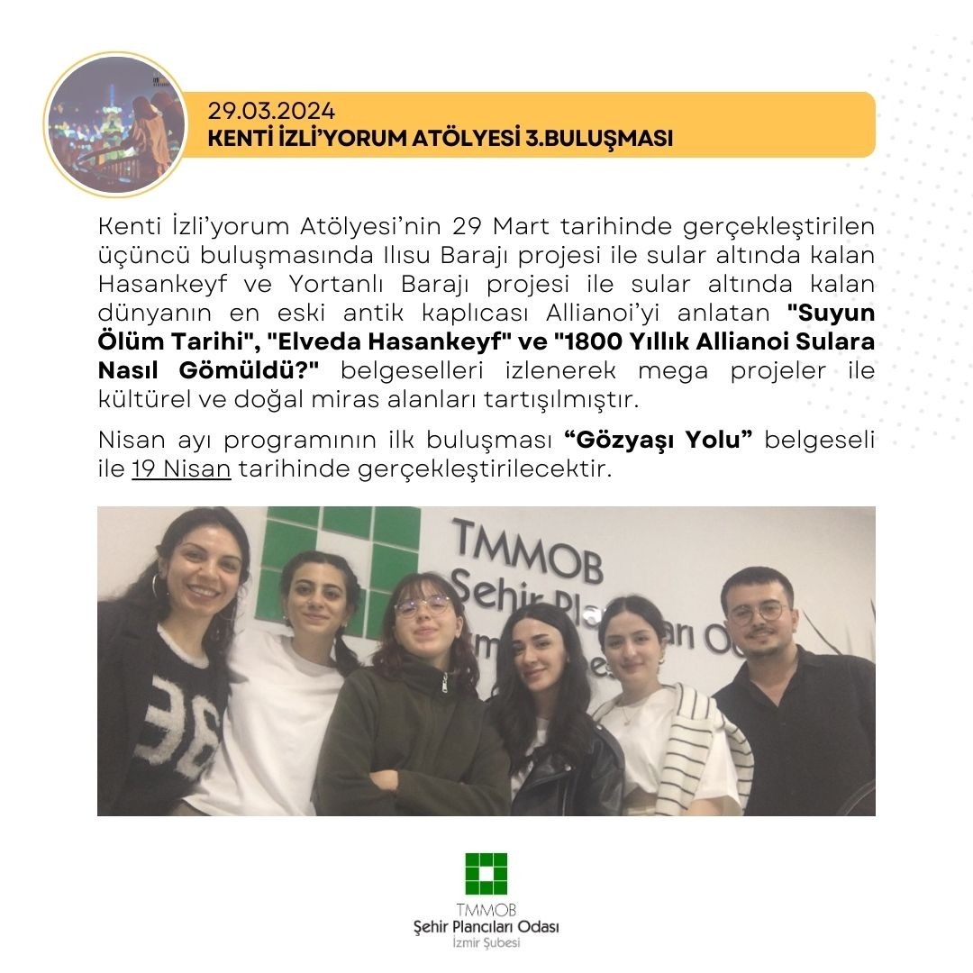 Kenti İzli`yorum Atölyesi`nin 29 Mart tarihinde gerçekleştirilen üçüncü buluşmasında Ilısu Barajı projesi ile sular altında kalan Hasankeyf ve Yortanlı Barajı projesi ile sular altında kalan dünyanın en eski antik kaplıcası Allianoi`yi anlatan "Suyun Ölüm Tarihi", "Elveda Hasankeyf" ve "1800 Yıllık Allianoi Sulara Nasıl Gömüldü?" belgeselleri izlenerek mega projeler ile kültürel ve doğal miras alanları tartışılmıştır.