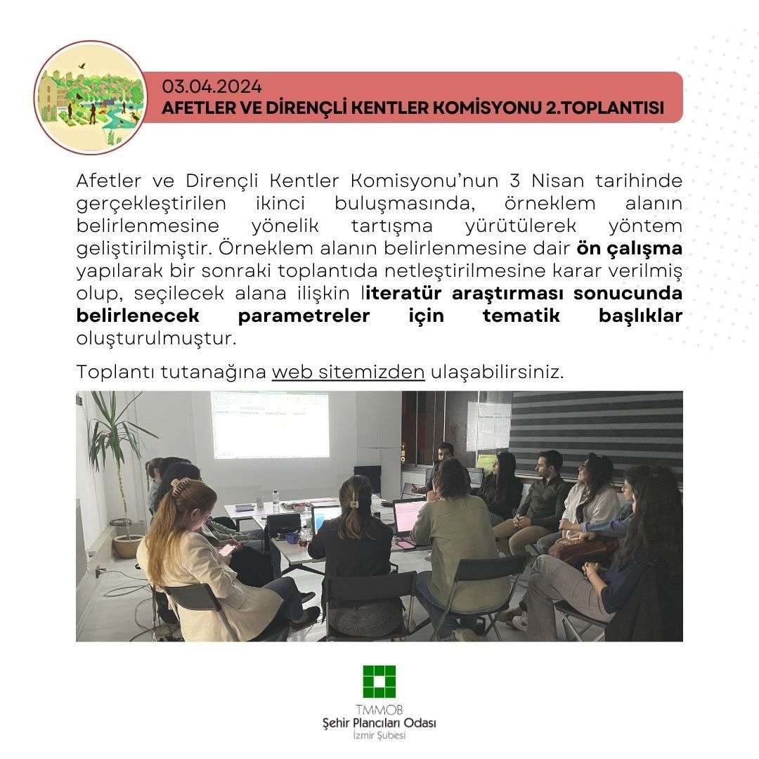 Afetler ve Dirençli Kentler Komisyonu`nun 3 Nisan tarihinde gerçekleştirilen ikinci buluşmasında, örneklem alanın belirlenmesine yönelik tartışma yürütülerek yöntem geliştirilmiştir. Örneklem alanın belirlenmesine dair ön çalışma yapılarak bir sonraki toplantıda netleştirilmesine karar verilmiş olup, seçilecek alana ilişkin literatür araştırması sonucunda belirlenecek parametreler için tematik başlıklar oluşturulmuştur.