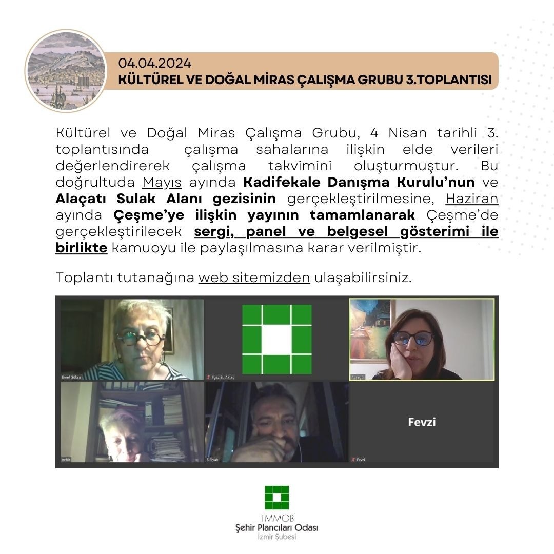 Kültürel ve Doğal Miras Çalışma Grubu, 4 Nisan tarihli 3. toplantısında çalışma sahalarına ilişkin elde verileri değerlendirerek çalışma takvimini oluşturmuştur. Bu doğrultuda Mayıs ayında Kadifekale Danışma Kurulu`nun ve Alaçatı Sulak Alanı gezisinin gerçekleştirilmesine, Haziran ayında Çeşme`ye ilişkin yayının tamamlanarak Çeşme`de gerçekleştirilecek sergi, panel ve belgesel gösterimi ile birlikte kamuoyu ile paylaşılmasına karar verilmiştir.