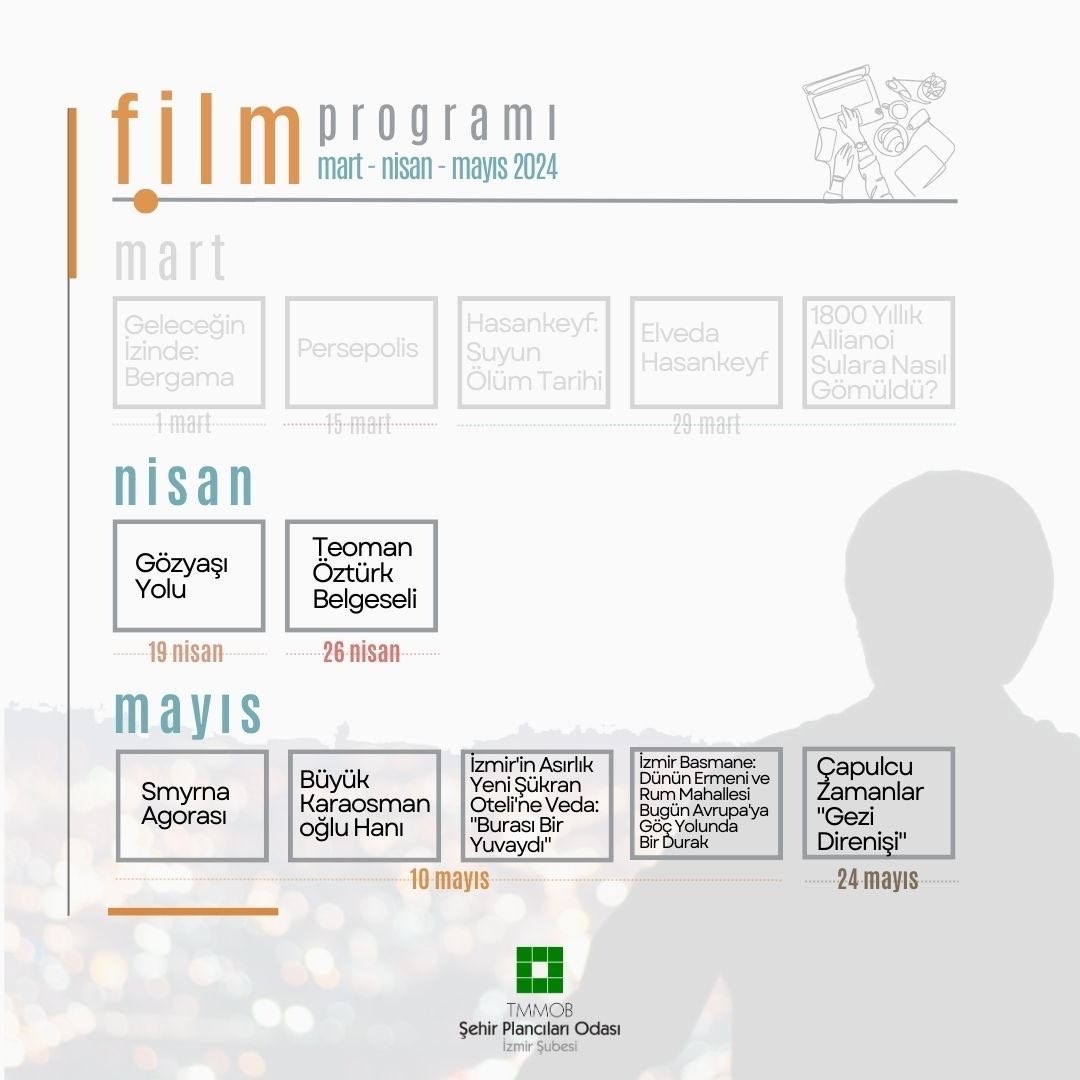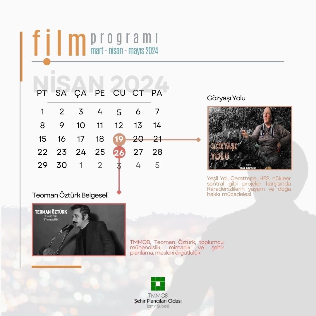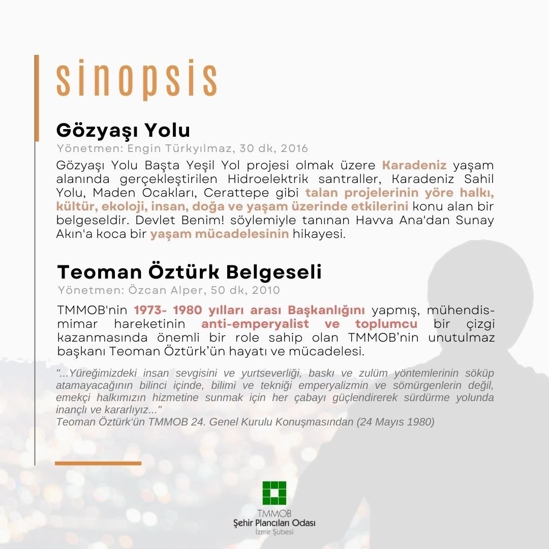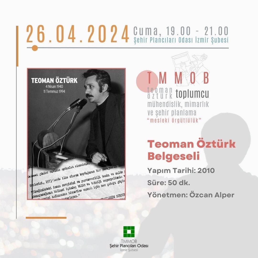 26.04.2024: "TEOMAN ÖZTÜRK BELGESELİ" : TMMOB`nin bugünkü toplumcu çizgisinin yaratıcılarından olan ve TMMOB`nin 1973 ve 1980 yılları arasında başkanlığını yapan Teoman Öztürk üzerinden toplumcu mühendislik, mimarlık ve şehir planlama, 1 Mayıs ve mesleki mücadelemiz,