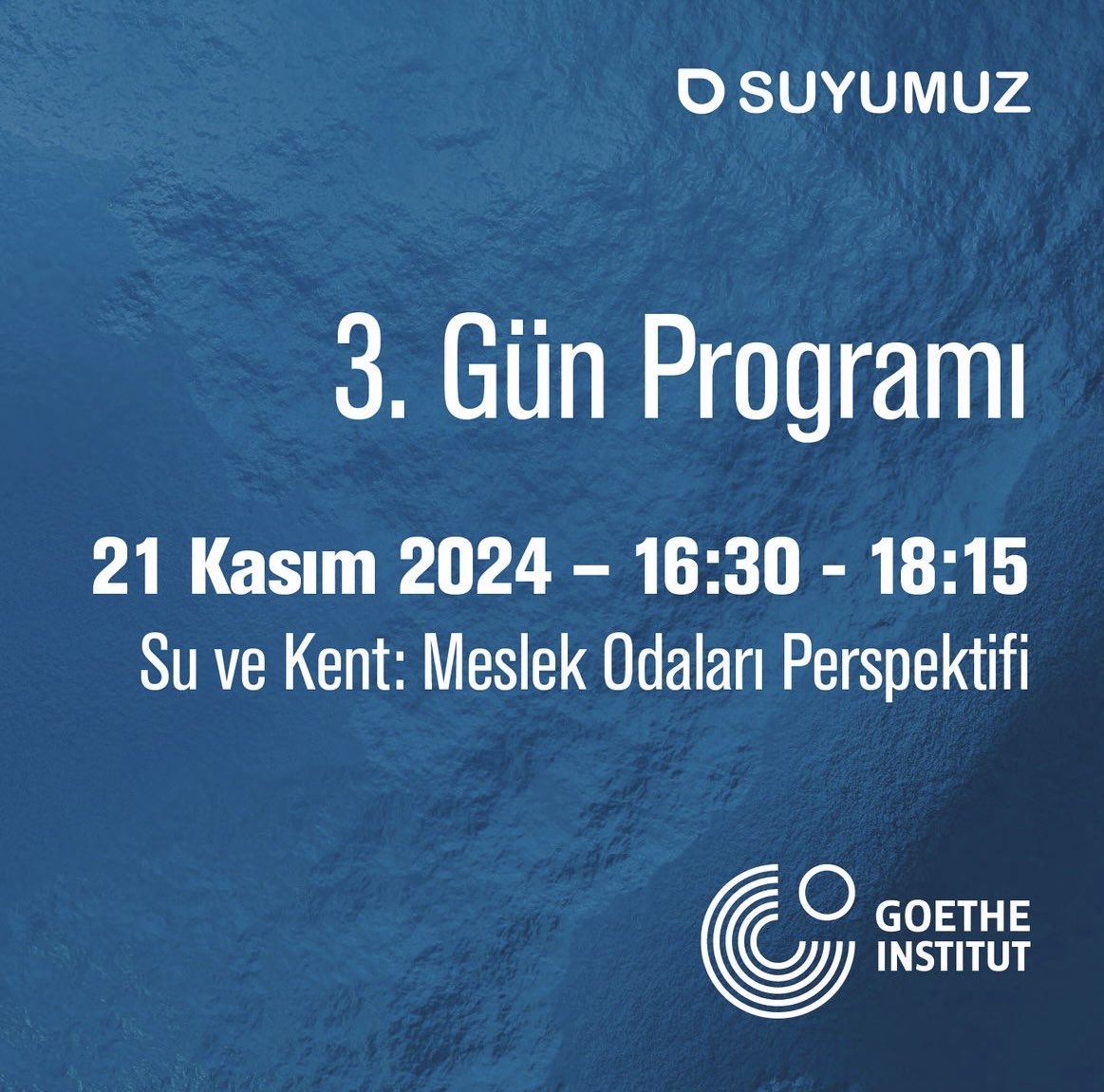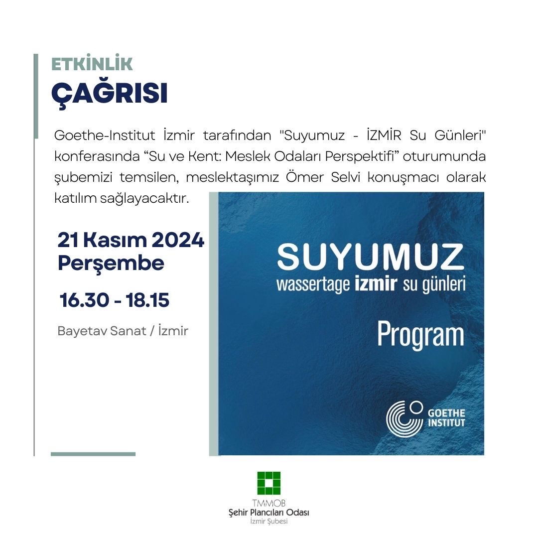 Goethe-Institut İzmir tarafından "Suyumuz - İZMİR Su Günleri" konferasında "Su ve Kent: Meslek Odaları Perspektifi" oturumunda şubemizi temsilen, meslektaşımız Ömer Selvi konuşmacı olarak katılım sağlayacaktır.