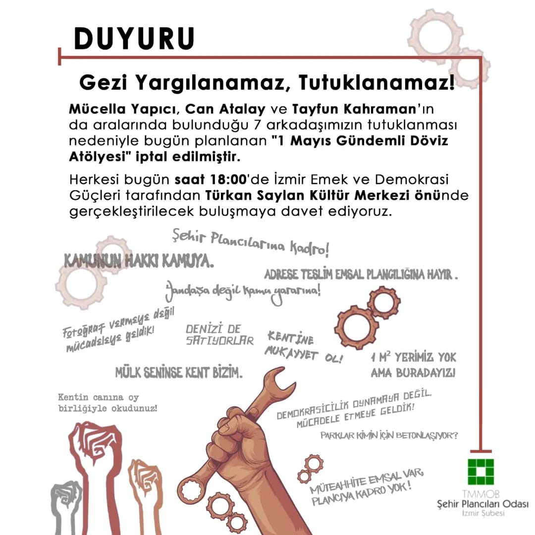 Mücella Yapıcı, Can Atalay ve Tayfun Kahraman`ın da aralarında bulunduğu 7 arkadaşımızın tutuklanması nedeniyle bugün planlanan "1 Mayıs Gündemli Döviz Atölyesi" iptal edilmiştir. Herkesi bugün saat 18:00de İzmir Emek ve Demokrasi Güçleri tarafından Türkan Saylan Kültür Merkezi önünde gerçekleştirilecek buluşmaya davet ediyoruz.
