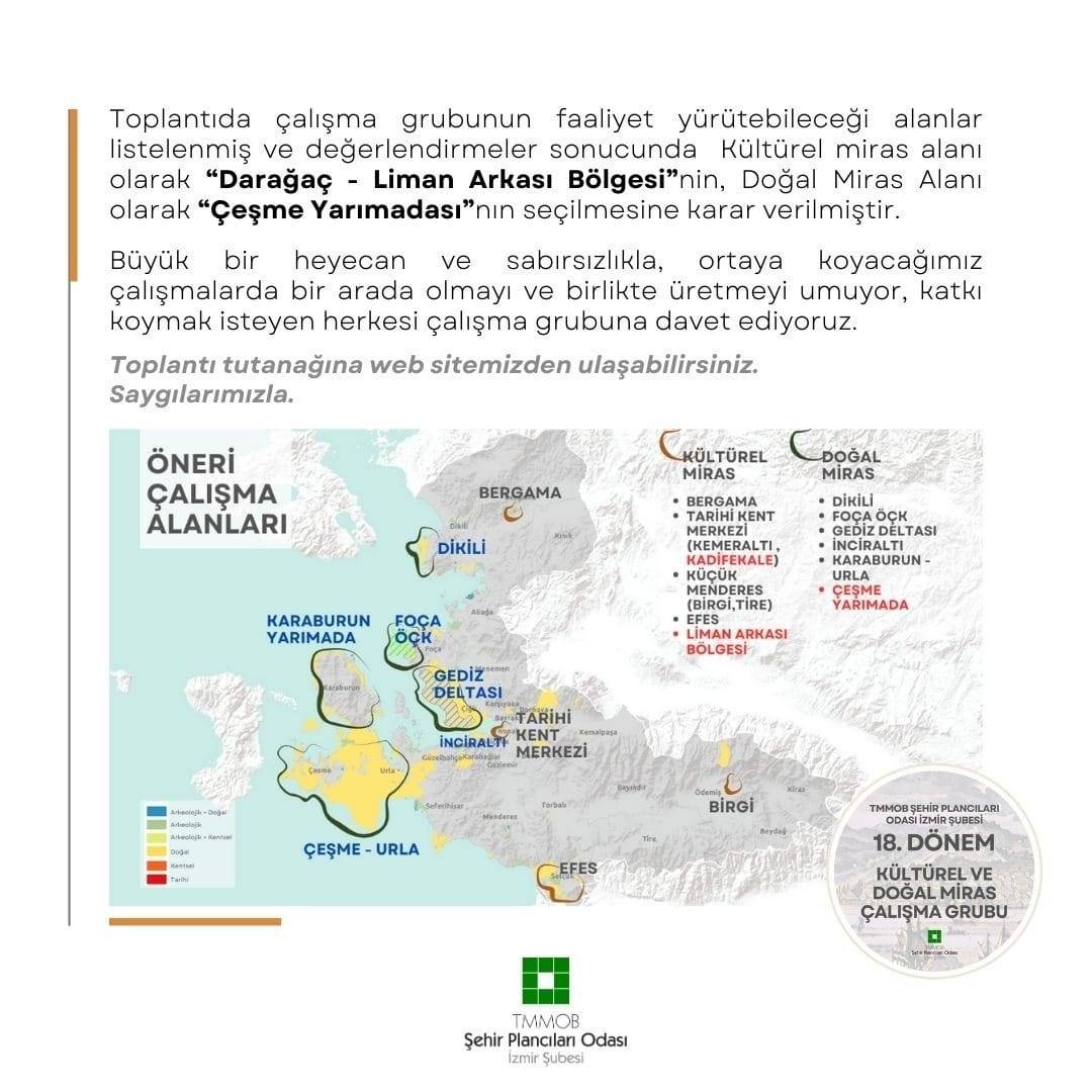 Toplantıda çalışma grubunun faaliyet yürütebileceği alanlar listelenmiş ve değerlendirmeler sonucunda Kültürel miras alanı olarak "Darağaç - Liman Arkası Bölgesi"nin, Doğal Miras Alanı olarak "Çeşme Yarımadası"nın seçilmesine karar verilmiştir.