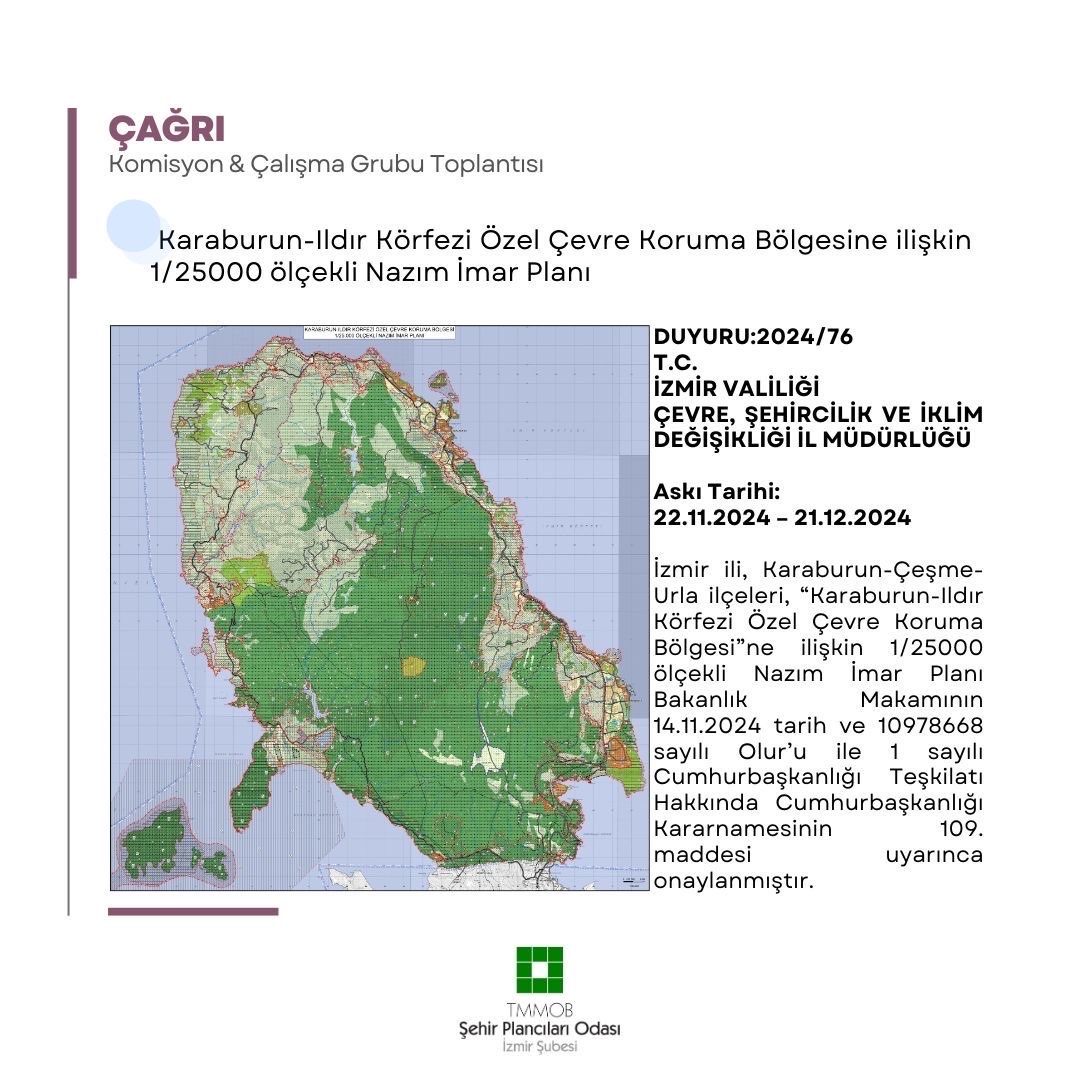 Plan İnceleme Komisyonu, 10 Aralık 2024 tarihinde 19.00`da şube mekanımızda "Üst Ölçekli Planlara ilişkin şubemizin yürüteceği çalışmanın programlanması ve Karaburun-Ildır Körfezi Özel Çevre Koruma Bölgesine ilişkin 1/25000 ölçekli Nazım İmar Planı`nın uygulamalı olarak incelenmesi" gündemleriyle dördüncü toplantısını gerçekleştirecektir.
