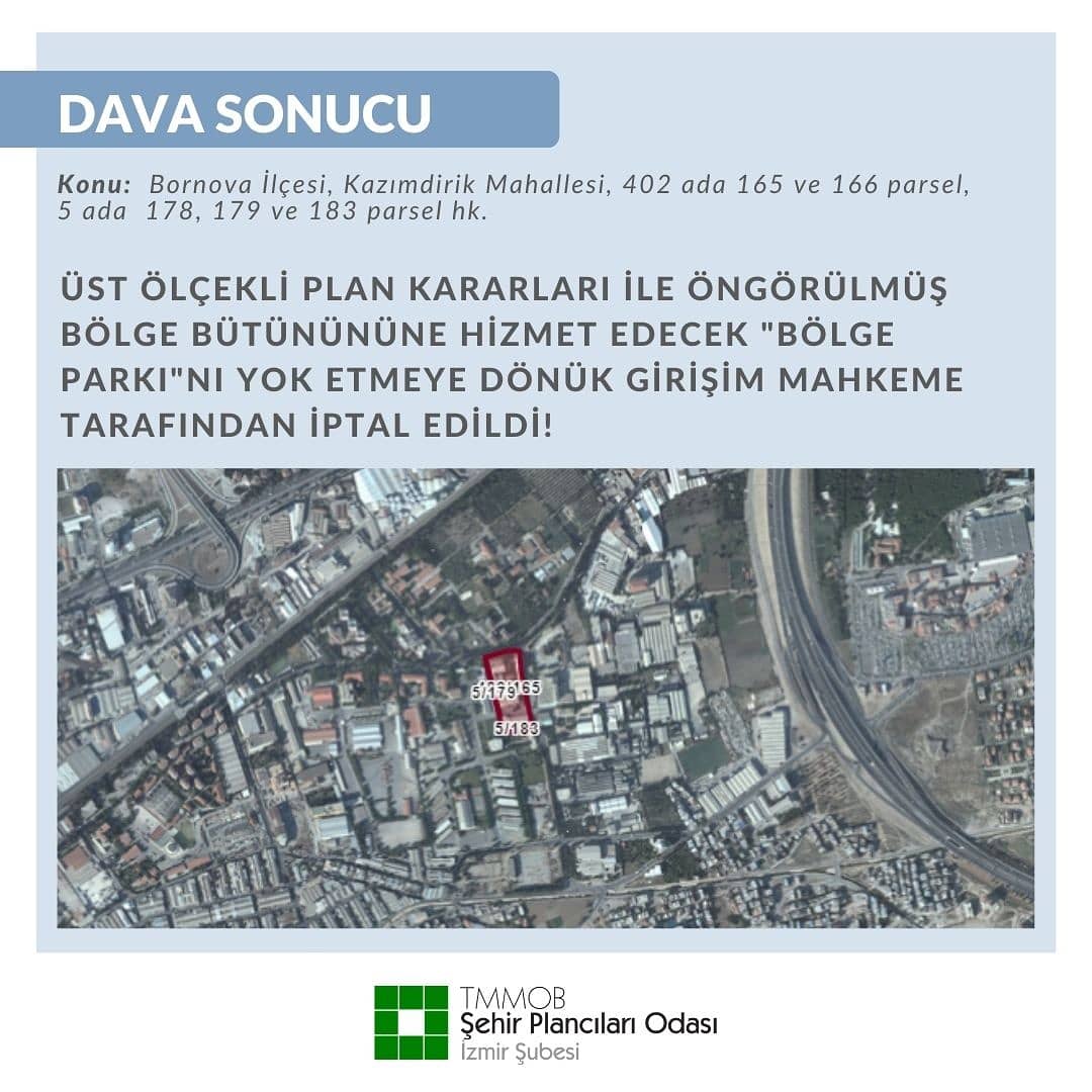 İzmir İli, Bornova İlçesi, Kazımdirik Mahallesi, 402 ada 165 parsel, 5 ada 179 parsel, 5 ada 183 parsel, 5 ada 178 parsel ile 402 ada 166 parseli kapsayan planlama alanına ilişkin plan müellifince hazırlanan 1/25.000 ölçekli Çevre Düzeni Planı Değişikliği, 1/5000 ölçekli Nazım İmar Planı Değişikliği ve 1/1000 ölçekli Uygulama İmar Planı Değişikliğine 16.09.2019-16.10.2019 tarihleri arasındaki askı sürecinde yapılan itiraz ve görüşler sonucu söz konusu itirazların kısmen ret, kısmen kabulü kapsamında yapılan düzenlemeleri içeren 1/5000 ölçekli Nazım ve 1/1000 ölçekli Uygulama İmar Planı Değişikliği Cumhurbaşkanlığı 1 Numaralı Kararnamesinin 102. maddesi, 6306 sayılı kanunun 6. maddesi ve aynı Kanunun Uygulama Yönetmeliğinin 18. maddesinin 2(a) bendi ile 3194 sayılı İmar Kanunu`nun 9. Maddesi kapsamında Çevre Ve Şehircilik Bakanlığı`nın 17.01.2020 tarihli ve 11555 sayılı yazısı ekinde onanan 1/5.000 ölçekli Nazım İmar Planı değişikliği ve 1/1000 ölçekli Uygulama İmar Planı değişikliği ile bu işlemlerin dayanağı olan 1/25000 ölçekli Çevre Düzeni İmar Planı değişikliğinin yürütmesinin durdurulması ve iptaline ilişkin Şubemiz tarafından İzmir İzmir 3.İdare Mahkemesinin 2020/648 Esasına kayden dava açılmıştır.