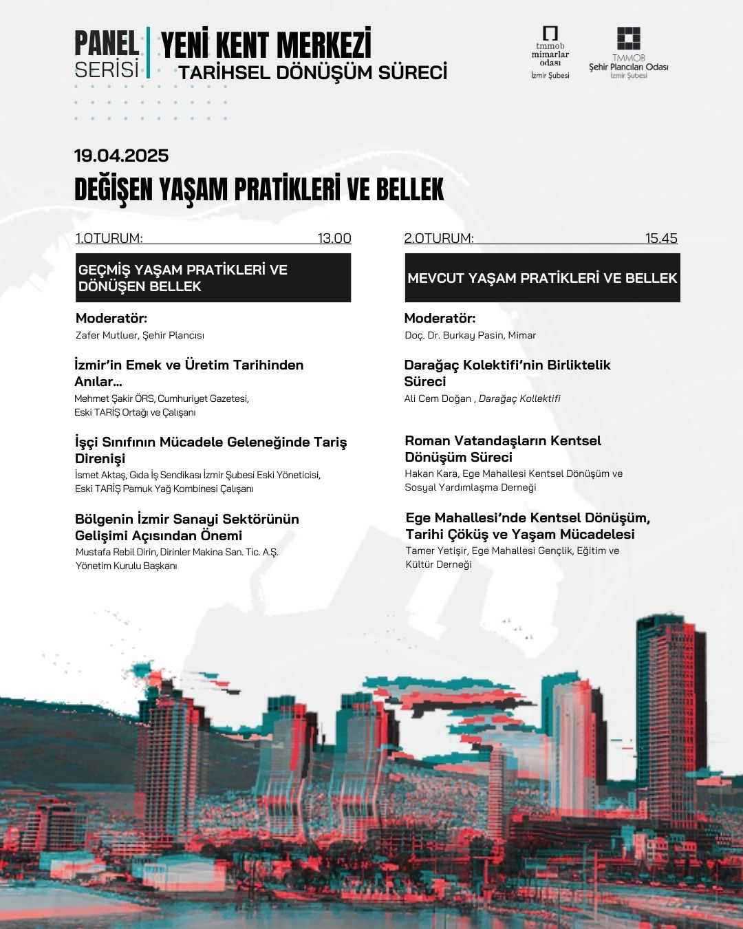 TMMOB Mimarlar Odası İzmir Şubesi ve TMMOB Şehir Plancıları Odası İzmir Şubesi olarak ortak düzenlediğimiz "Yeni Kent Merkezi Tarihsel Dönüşüm Süreci" başlıklı paneller serisi; 12 Nisan ve 19 Nisan 2025 tarihlerinde 13.00-18.00 saatleri arasında İzmir Mimarlık Merkezi`nde gerçekleştirilecektir.