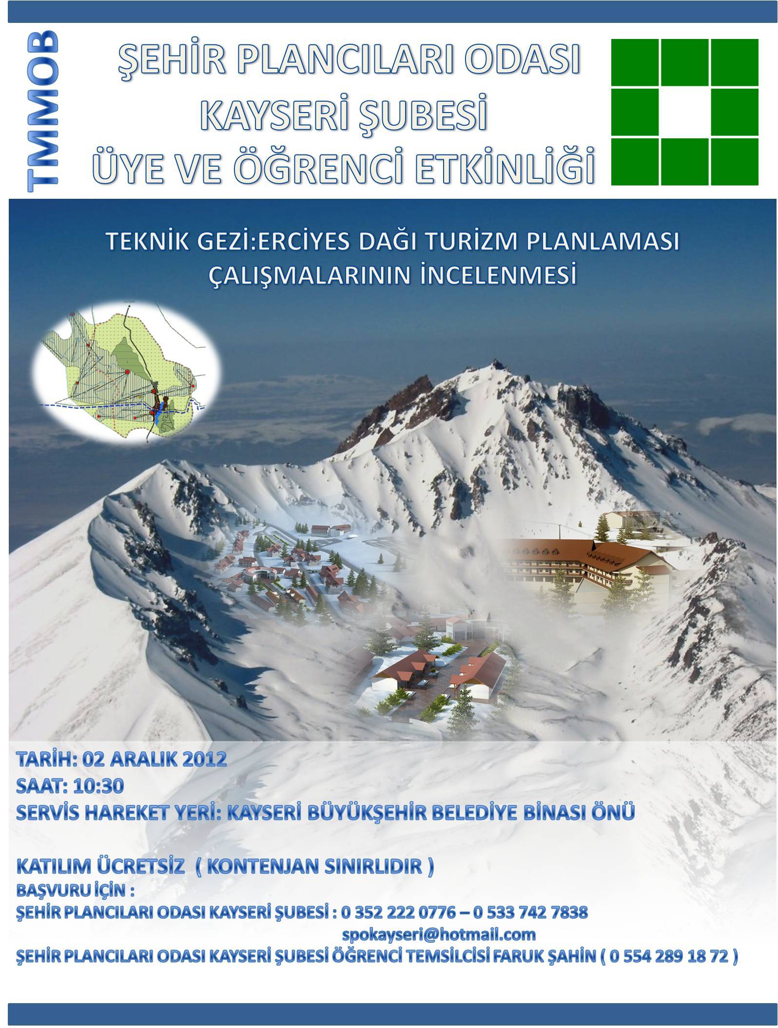 Erciyes Kış Sporları ve Turizm Merkezi Projesi‘nin yerinde incelenmesi amacıyla üyelerimiz ve planlama öğrencilerimizle birlikte, Kayseri Büyükşehir Belediyesi‘nin de destekleri ile 2 Aralık 2012 Pazar günü bir teknik gezi düzenledik. Proje alanına yapılan gezi sonrasında Erciyes A.Ş. Genel Müdür Yardımcısı Yücel İKİLER, Erciyes Master Planı ile bilgiler vererek, projenin etaplarından, maliyet ve finansmanından, gerçekleştirilen yatırımlar ve kapasitelerinden bahsetti.