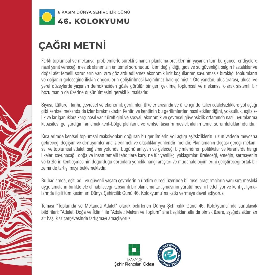8 Kasım Dünya Şehircilik Günü Etkinlikleri kapsamında her yıl düzenlenen Şehircilik Kolokyumu`nun bu yıl 46`ncısı Oda Genel Merkezi sekreteryasında ve Eskişehir Büyükşehir Belediyesi ev sahipliğinde 6-7-8 Kasım 2022 tarihlerinde "Toplumda ve Mekanda Adalet" temasıyla gerçekleştirilecektir.