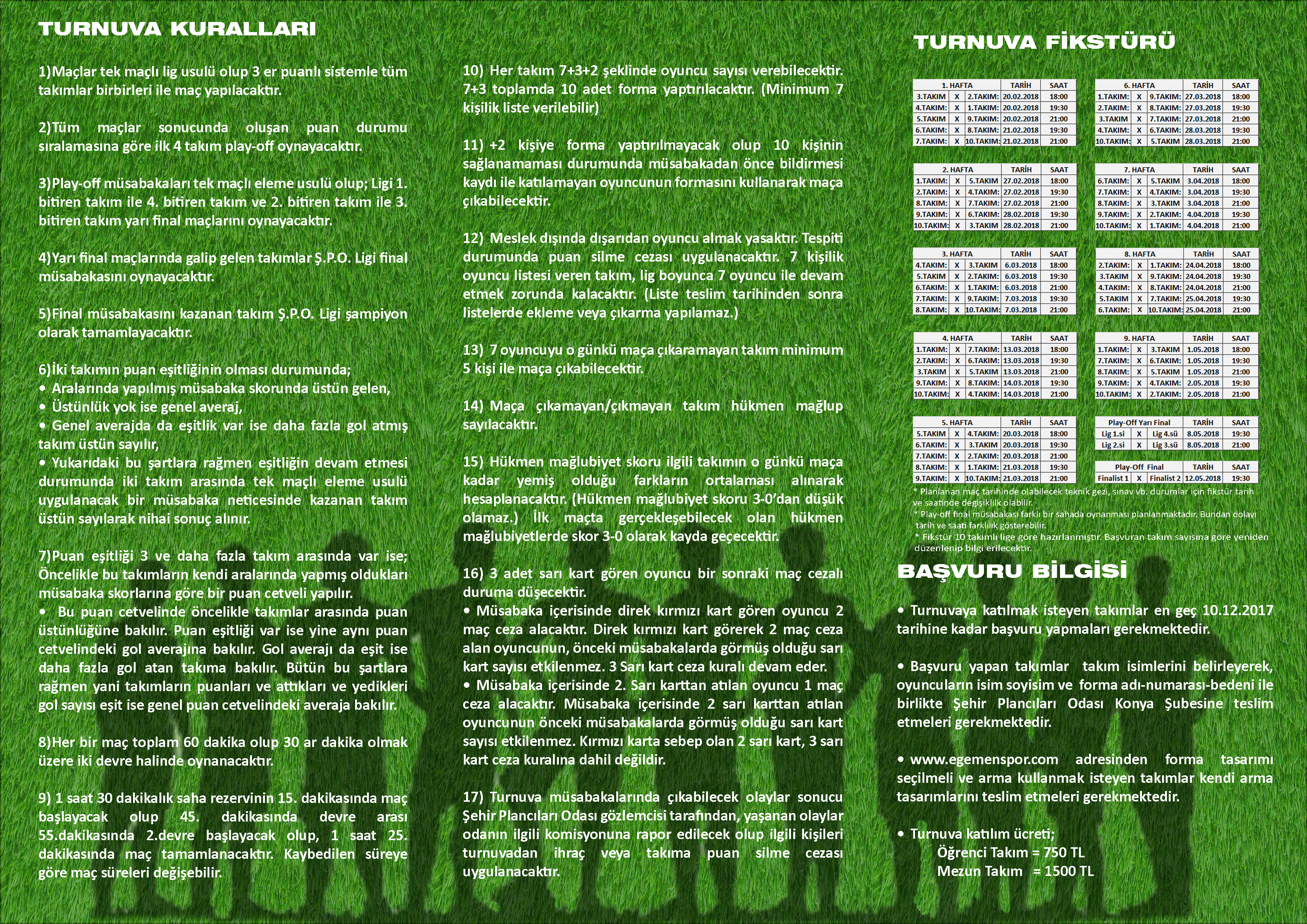 20 ŞUBAT- 12 MAYIS 2018 TARİHLERİNDE YAPILACAK OLAN ŞUBEMİZ 2018 SEZONU FUTBOL TURNUVASINA KATILIM BAŞVURULARIMIZ DEVAM ETMEKTEDİR.