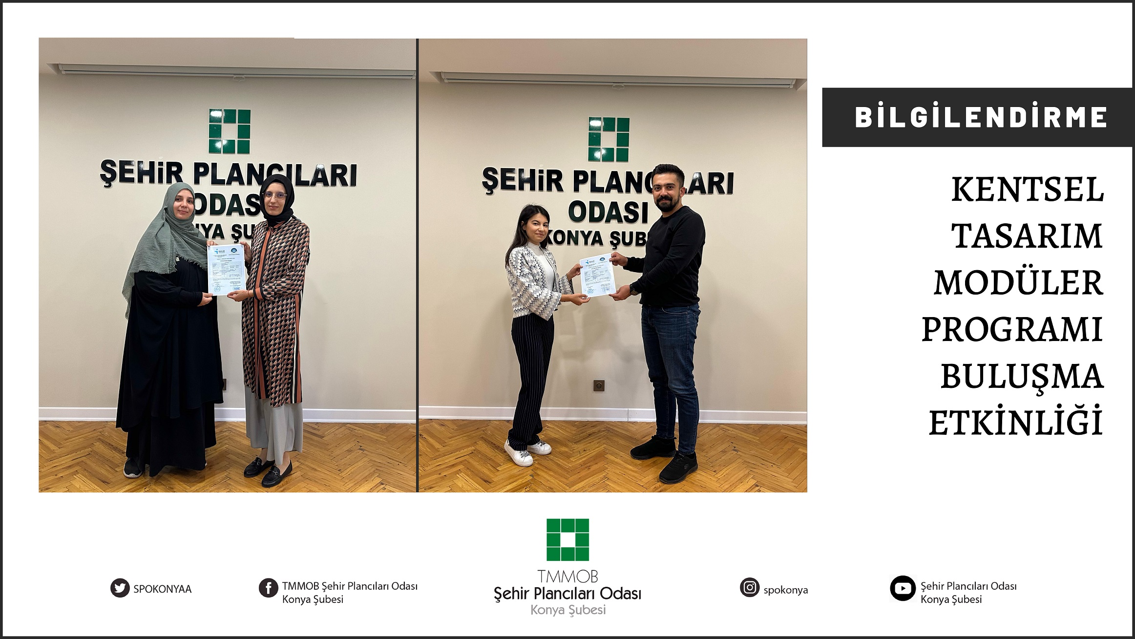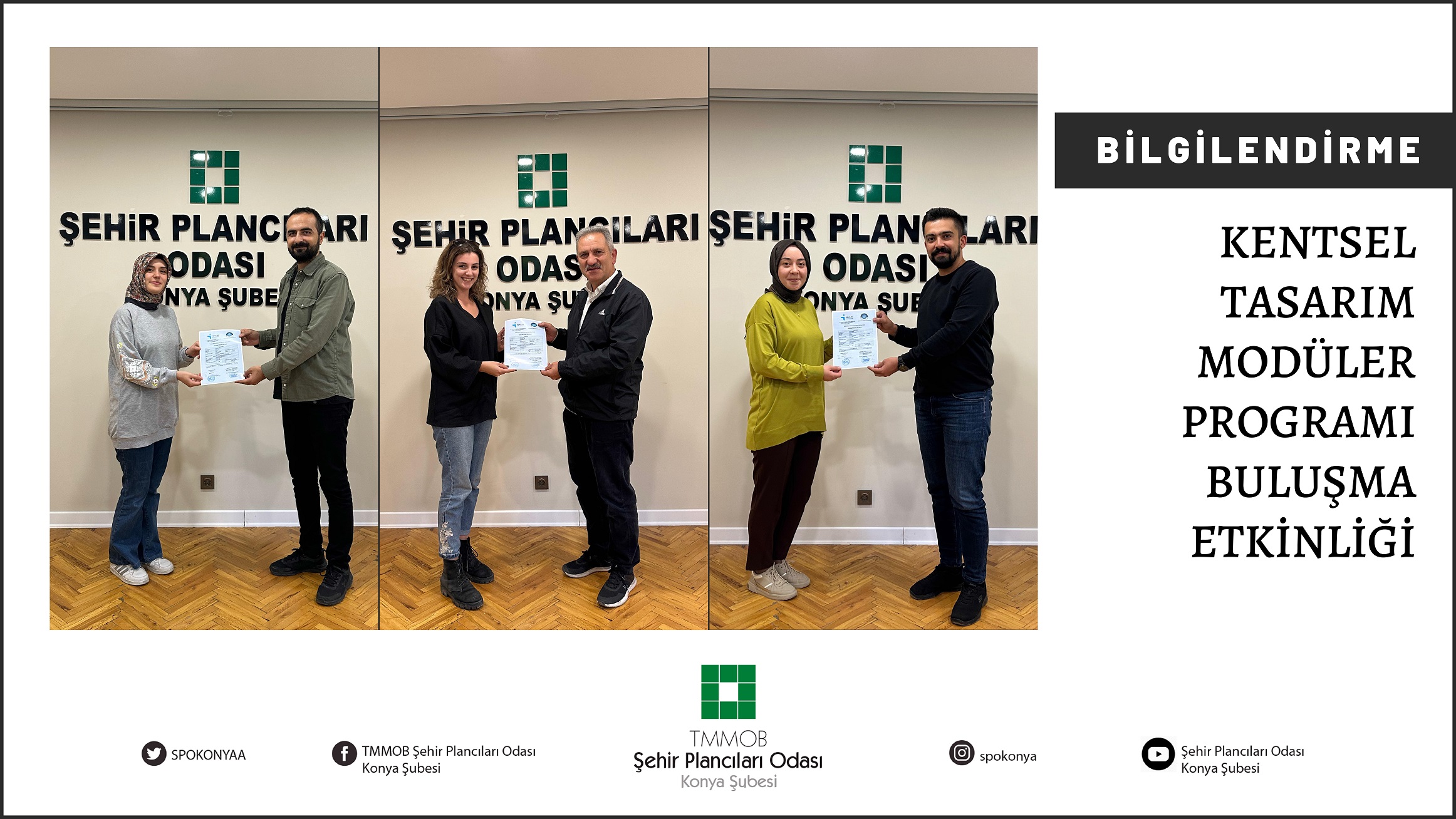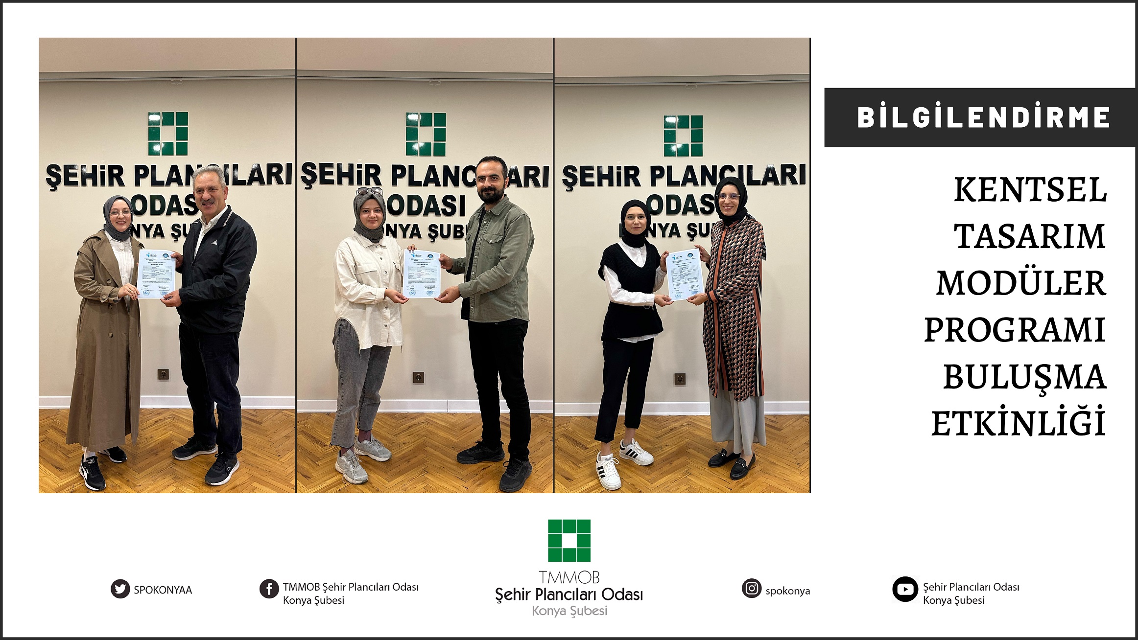 Şehir Plancıları Odası Konya Şubesi - İŞKUR - Necmettin Erbakan Üniversitesi Ortaklığında, meslektaşımız Fatih Yılmaz`ın girişimleriyle, 9 ve 10. Dönem yönetim kurulunca düzenlenen Kentsel Tasarım Modüler Programı tamamlanmıştır. Öğretim programının sonunda Mimari Yapı Teknik Ressam mesleğinde yeterliklerini kazanan katılımcılara Şubemizce 21 Ekim Cumartesi günü düzenlemiş olduğumuz buluşma etkinliğimizde sertifikaları verilmiştir.