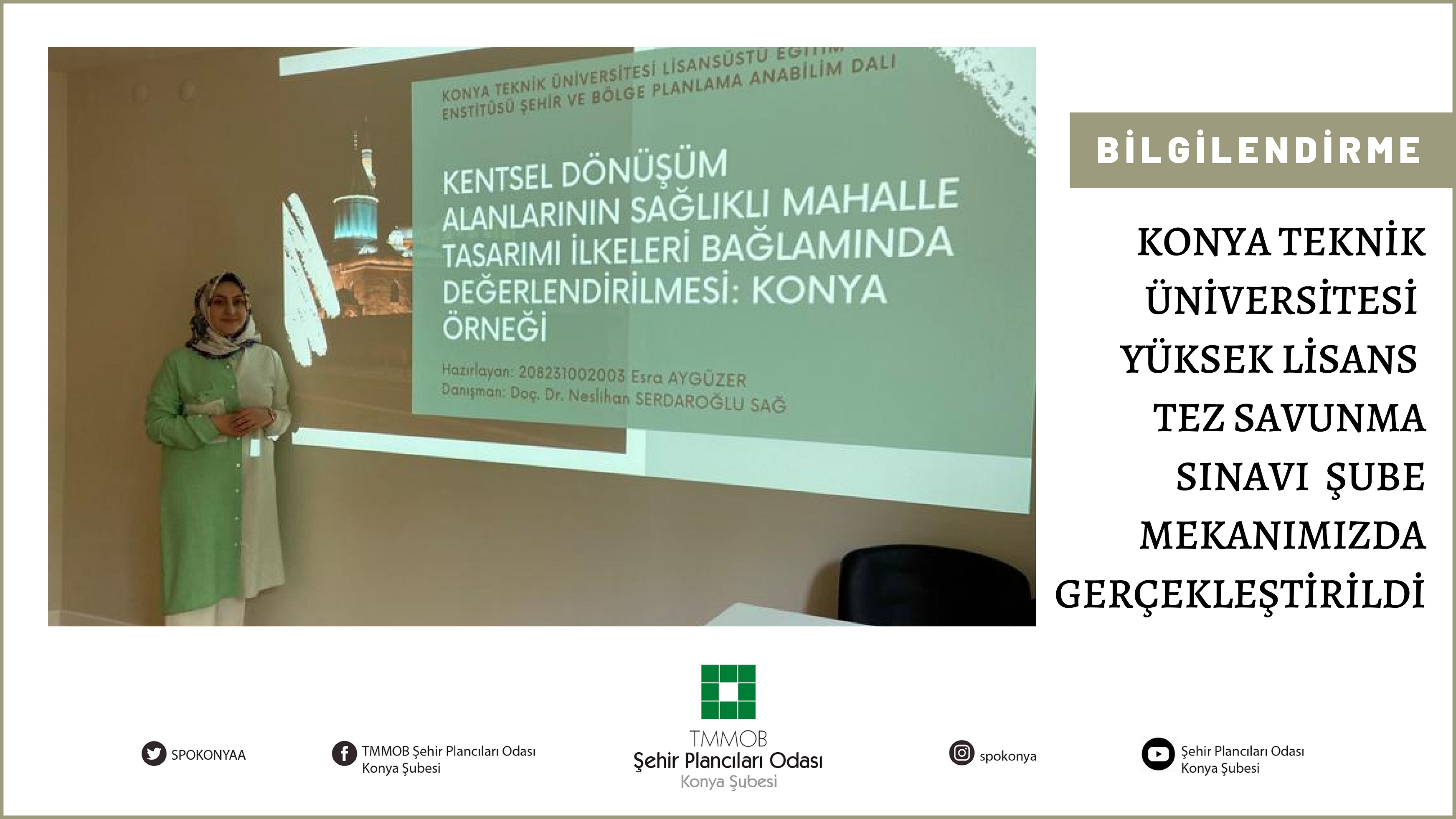 Doç. Dr. Neslihan Serdaroğlu Sağın danışmanlığında Prof. Dr. Mehmet Topçu ve Necmettin Erbakan Üniversitesi Mimarlık Bölümünden Doç. Dr. Hatice Derya Arslanın Juri üyeliğini yaptığı, Konya Teknik Üniversitesi yüksek lisans öğrencisi Esra Aygüzerin "Kentsel Dönüşüm Alanlarının Sağlıklı Mahalle Tasarımı İlkeleri Bağlamında Değerlendirilmesi: Konya Örneği" başlıklı tez savunma sınavı 15.06.2023 tarihinde Şehir Plancıları Odası Konya Şubemizde gerçekleştirilmiştir.