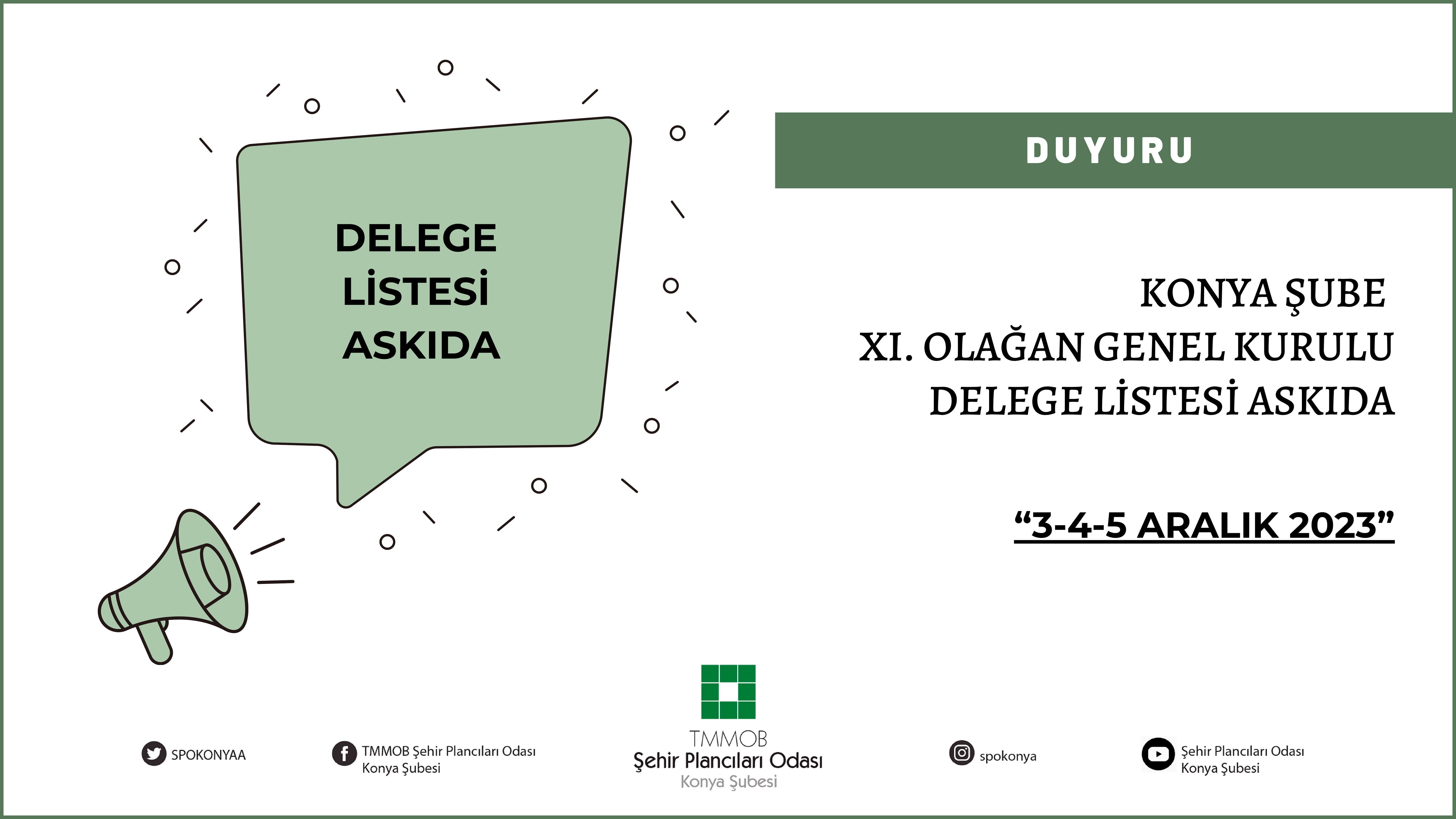 Konya Şube 11. Olağan Genel Kuruluna katılacak ve seçimlerde oy kullanacaklara ait delege listesi 3-4-5 Aralık 2023 tarihlerinde (Pazar-Pazartesi-Salı) Konya Şubede askıda ilan edilecektir.