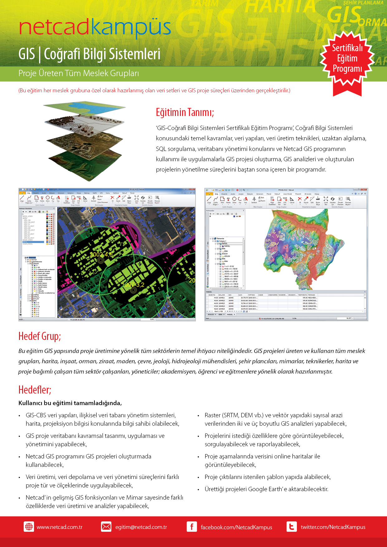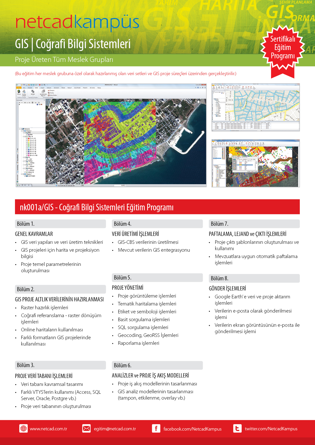 GIS-Coğrafi Bilgi Sistemleri Sertifikalı Eğitim Programı`, Coğrafi Bilgi Sistemleri konusundaki temel kavramlar, veri yapıları, veri üretim teknikleri, uzaktan algılama, SQL sorgulama, veritabanı yönetimi konularını ve Netcad GIS programının kullanımı ile uygulamalarla GIS projesi oluşturma, GIS analizleri ve oluşturulan projelerin yönetilme süreçlerini baştan sona içeren bir programdır.