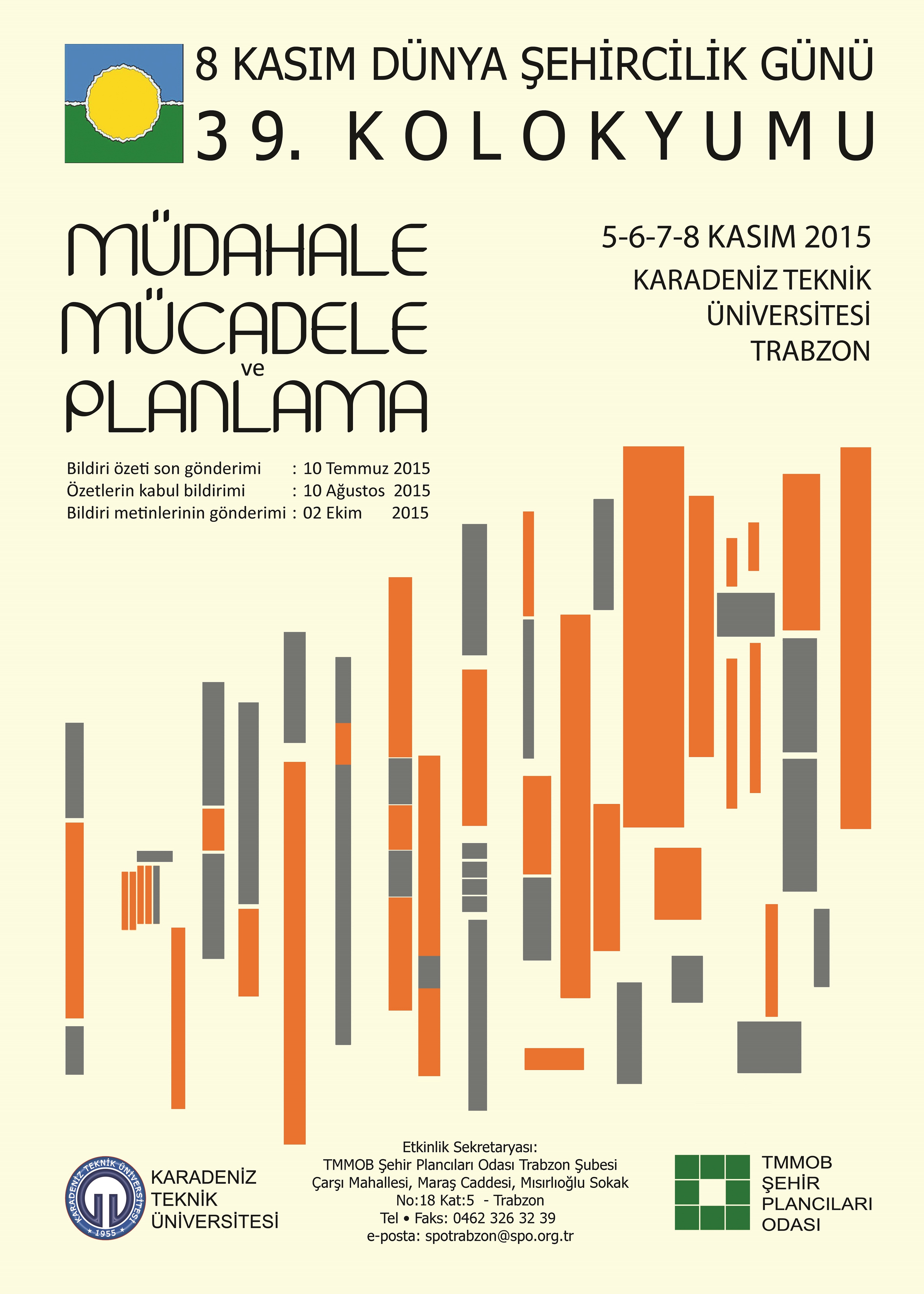 Bu çerçevede; her yıl 8 Kasım Dünya Şehircilik Günü etkinlikleri kapsamında, bu yıl 39.su düzenlenecek olan Dünya Şehircilik Günü Kolokyumu`nun ana teması; "Müdahale, Mücadele ve Planlama" olarak belirlenmiştir. 5-8 Kasım 2015 tarihlerinde, Trabzonda; TMMOB Şehir Plancıları Odası Trabzon Şubesi sekretaryasında ve Karadeniz Teknik Üniversitesi ev sahipliğinde gerçekleştirilecek olan, 39. Dünya Şehircilik Günü Kolokyumu`nda belirlenen ana tema çerçevesinde;