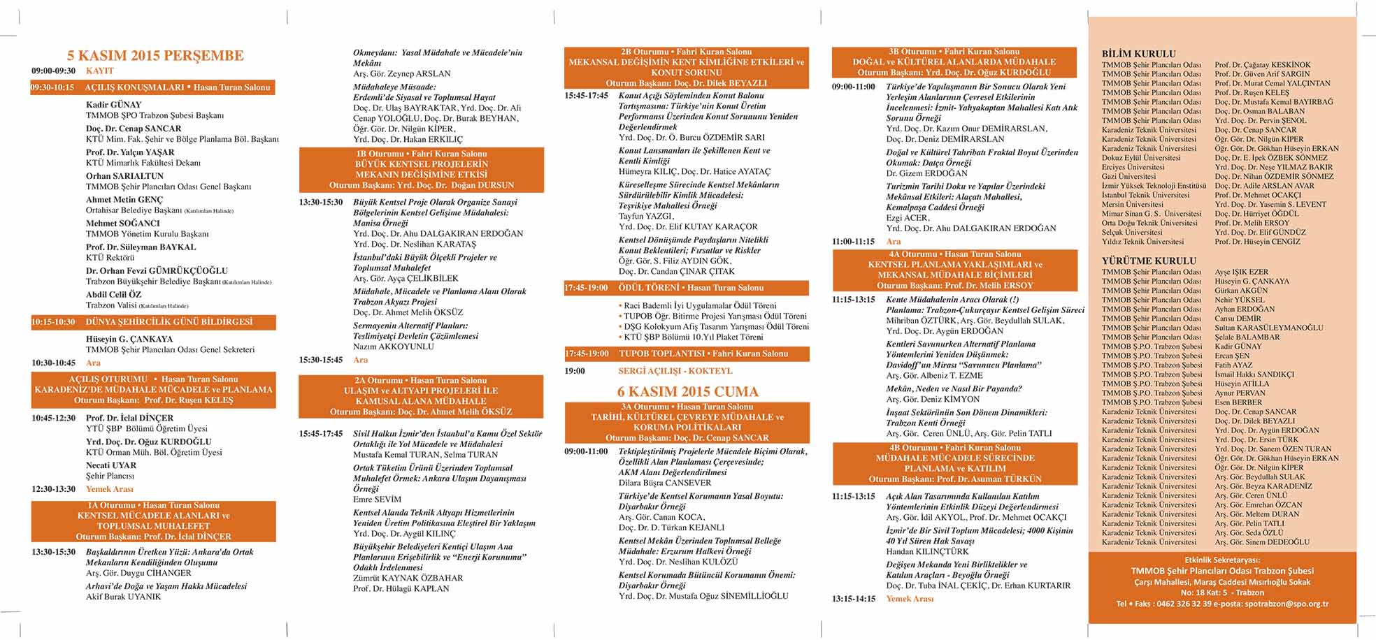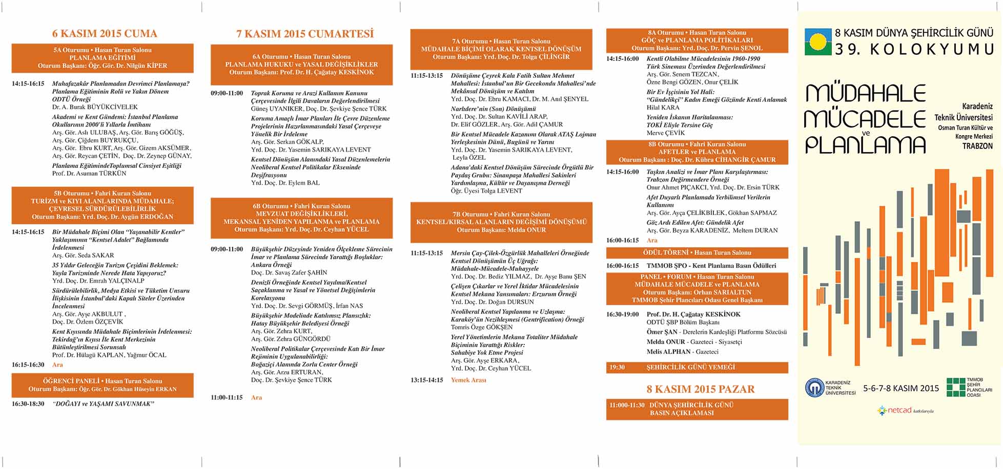 Her yıl 8 Kasım Dünya Şehircilik Günü etkinlikleri kapsamında düzenlenen Dünya Şehircilik Günü Kolokyumunun 39.su bu yıl Odamız Trabzon Şubesi sekretaryasında 5-8 Kasım 2015 tarihlerinde Trabzon`da, Karadeniz Teknik Üniversitesi ev sahipliğinde; "Müdahale, Mücadele ve Planlama" ana teması çerçevesinde gerçekleştirilecektir.