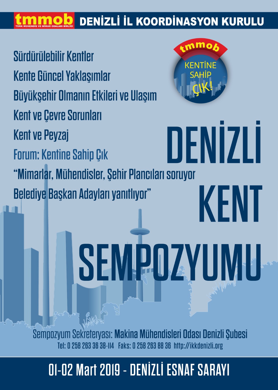 TMMOB Denizli İl Koordinasyon Kurulunca 01-02 Mart 2019 tarihlerinde Denizli Kent Sempozyumu gerçekleştirilecektir.