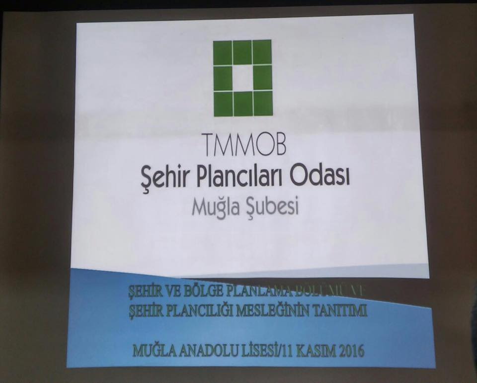 11 Kasım 2016 tarihinde TMMOB Şehir Plancıları Odası Muğla Şube Başkanı Sami Tomurcuklu, Şube Sekreteri Onur Demirtaş, Şube Saymanı Feyza Onay ve Yönetim Kurulu üyemiz Barış Çerçi; 8 Kasım Dünya Şehircilik Günü etkinliklerimiz kapsamında Muğla Anadolu Lisesi öğrencilerine "Şehir ve Bölge Planlama Bölümü ile Şehir Plancılığı Mesleğinin Tanıtımı" konulu sunum gerçekleştirerek öğrencilerden gelen soruları yanıtladı. Başta Muğla Anadolu Lisesi yönetimine katkıları ve bizlere imkân tanıdıkları için, öğrencilerimize de ilgileri için teşekkür eder; başarılı bir öğretim yılı dileriz.