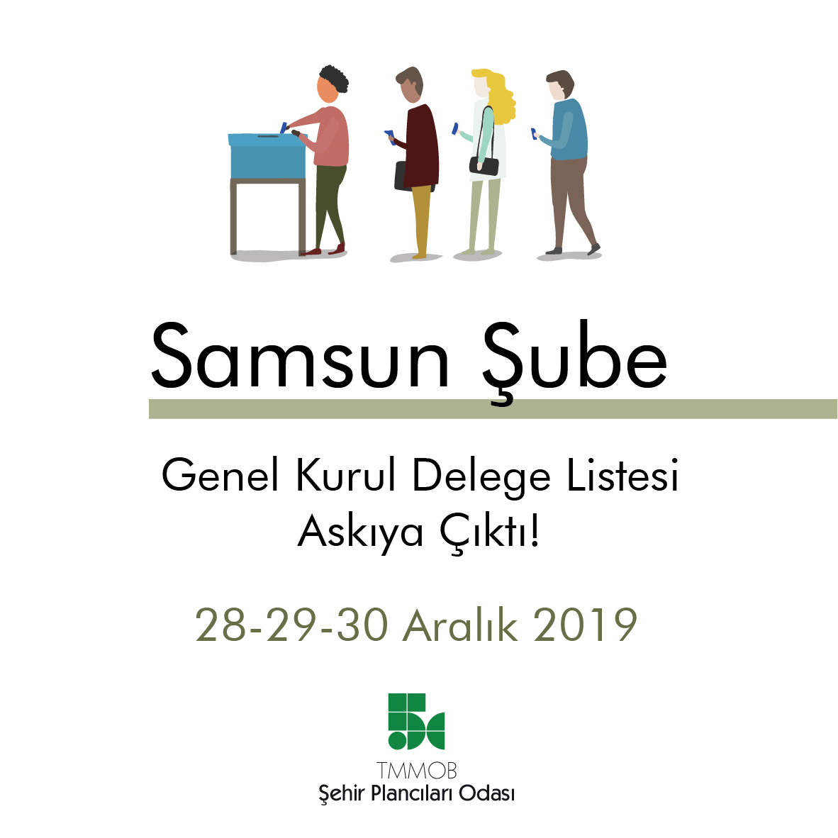 Samsun Şube 9. Olağan Genel Kuruluna katılacak ve seçimlerde oy kullanacaklara ait delege listesi 28-29-30 Aralık 2019 tarihlerinde (Cumartesi-Pazar-Pazartesi) Samsun Şubede askıda ilan edilecektir.