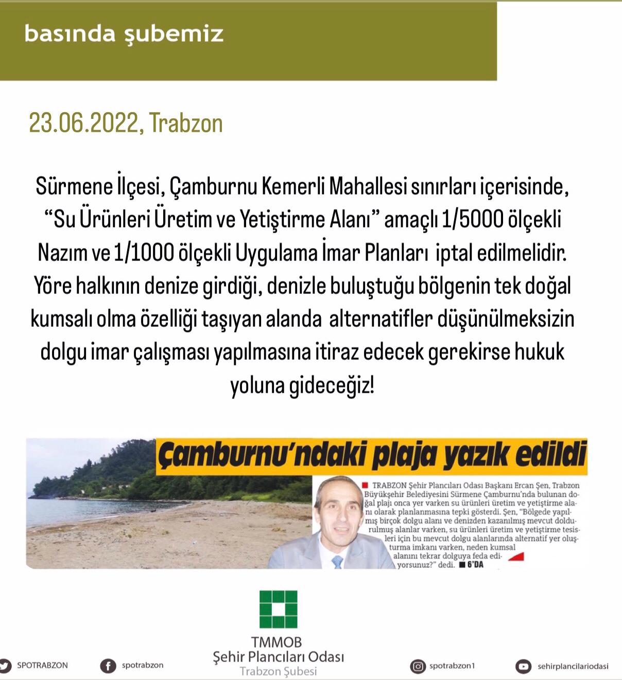 Trabzon Şehir Plancıları Odası Başkanı Ercan Şen, Trabzon Büyükşehir Belediyesini Sürmene Çamburnunda bulunan doğal plajı onca yer varken su ürünleri üretim ve yetiştirme alanı olarak planlanmasına tepki gösterdi. Şen, "Bölgede yapılmış birçok dolgu alanı ve denizden kazanılmış mevcut doldurulmuş alanlar varken, su ürünleri üretim ve yetiştirme tesisleri için bu mevcut dolgu alanlarında alternatif yer oluşturma imkanı varken, neden kumsal alanını tekrar dolguya feda ediyorsunuz?" dedi.