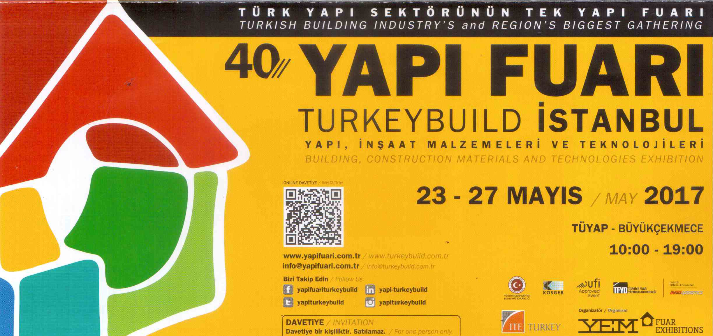 40. YAPI FUARI TURKEYBUIL İSTANBUL, 23-27 MAYIS 2017 TARİHLERİNDE TÜYAP BÜYÜKÇEKMECE‘DE YAPILACAK OLUP, KATILMAK İSTEYEN ÜYELERİMİZ, DAVETİYELERİNİ ŞUBEMİZDEN ALABİLİRLER.