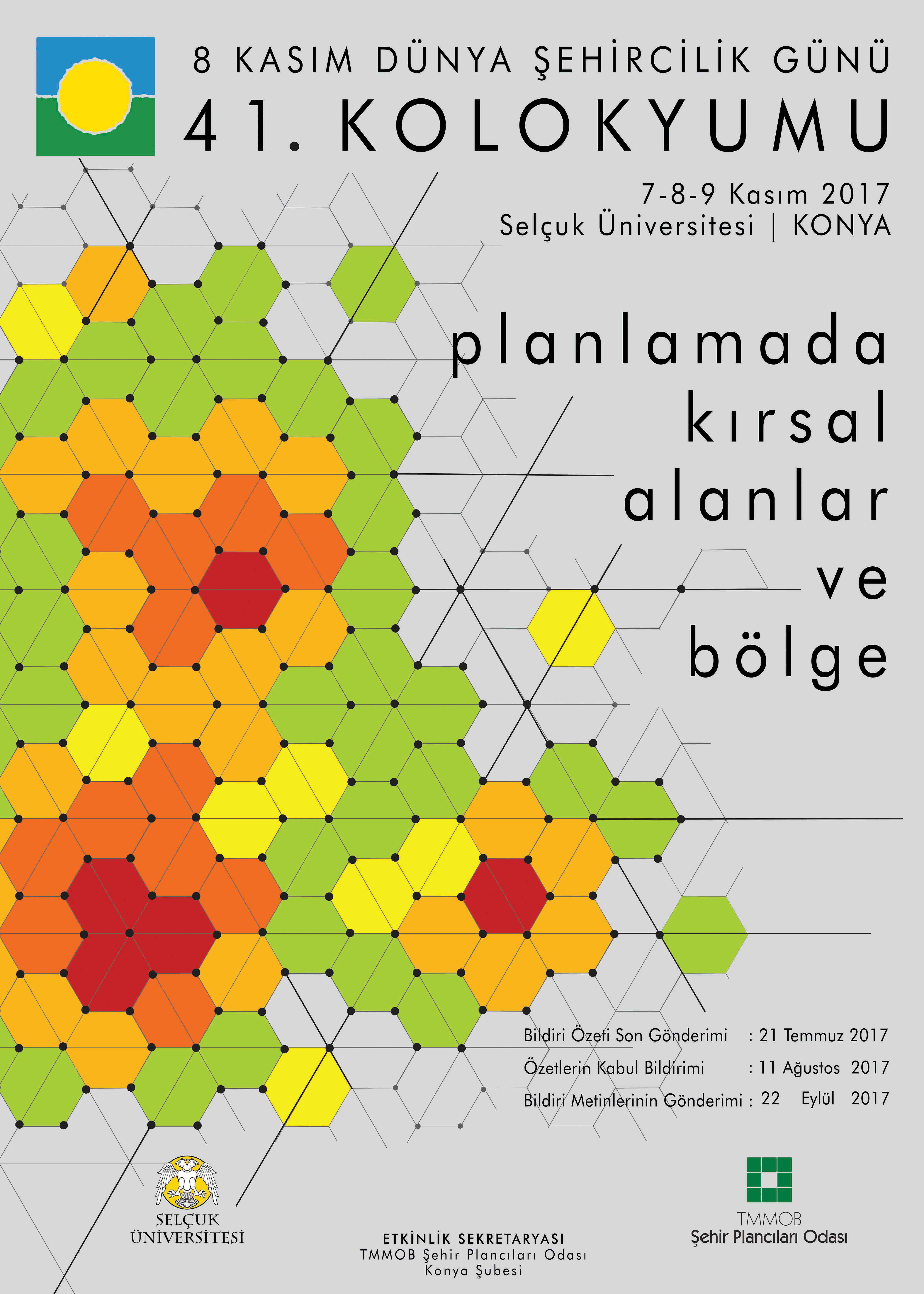 Bu çerçevede, 41.si gerçekleştirilecek olan 8 Kasım Dünya Şehircilik Günü Kolokyumunun konusu, "Planlamada Kırsal Alanlar ve Bölge" olarak belirlenmiştir. 7-8-9 Kasım 2017 tarihlerinde, Konya`da, Selçuk Üniversitesi ev sahipliğinde gerçekleştirilecek olan kolokyumda; aşağıda belirtilen başlıklar altında bildiri sunulması beklenmektedir. Kolokyumda sunuşu gerçekleştirilen bildiriler arasından, Bilim Kurulu tarafından seçilecek belirli sayıda bildiri; Kolokyum Bildiriler Kitabı öncesinde, TMMOB Şehir Plancıları Odası yayın organı Planlama Dergisi DŞG Özel Sayısı‘nda ve/veya Selçuk Üniversitesi Mimarlık Fakültesi yayın organı olan ICONARP‘ta (Uluslararası Mimarlık ve Planlama Dergisi) hakem değerlendirme sürecinin ardından yayınlanacaktır.