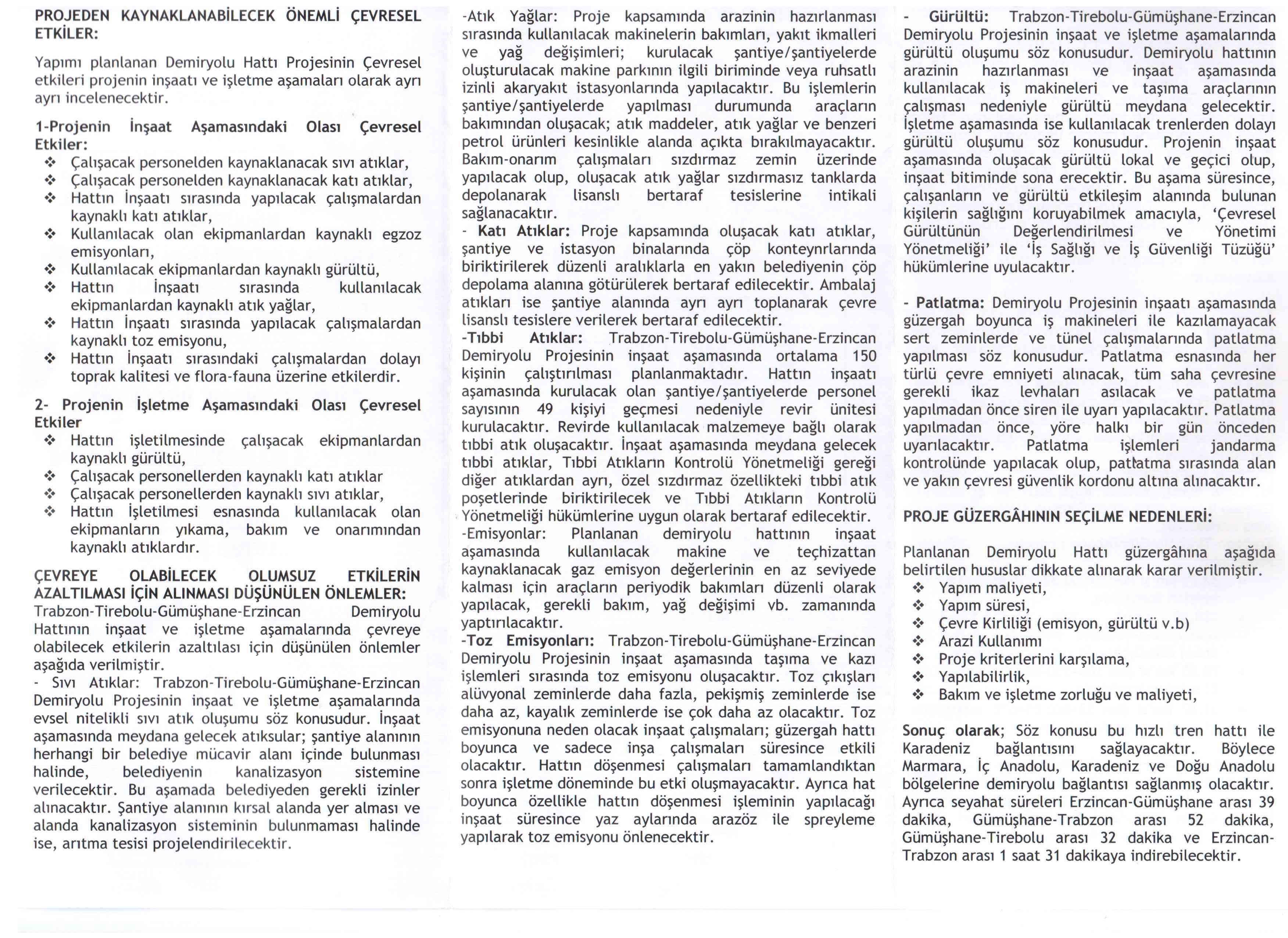 Trabzon, Gümüşhane, Giresun ve Erzincan illeri ile ilçeleri sınırlarında T.C. Ulaştırma, Denizcilik ve Haberleşme Bakanlığı DLH İnşaatı Genel Müdürlüğü tarafından yapılması planlanan "Trabzon, Gümüşhane, Giresun ve Erzincan Demiryolu Projesi" ile ilgili olarak 17.07.2008 tarih ve 26939 sayılı Çevresel Etki Değerlendirmesi (ÇED) Yönetmeliği 9. Maddesi gereğince "... halkı yatırım hakkında bilgilendirmek, projeye ilişkin görüş ve önerilerini almak ve Çevresel Etki Değerlendirmesi sürecine halkın katılımını sağlamak amacıyla" 21.12.2011 Çarşamba günü Hamamizade İhsan Bey Kültür Merkez‘inde düzenlenen halkın katılım toplantısına, Şubemizden Şube Sekreter Yardımcısı ve Mesleki Denetim Görevlisi Aynur TURAN katılmıştır.